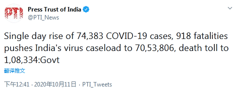 據(jù)報(bào)道,根據(jù)通報(bào),過去24小時(shí),印度新增74383例新冠肺炎確診病例,新增死亡病例918例,這使得該國累計(jì)新冠病例達(dá)到7053806例,其中死亡病例達(dá)到108334例。