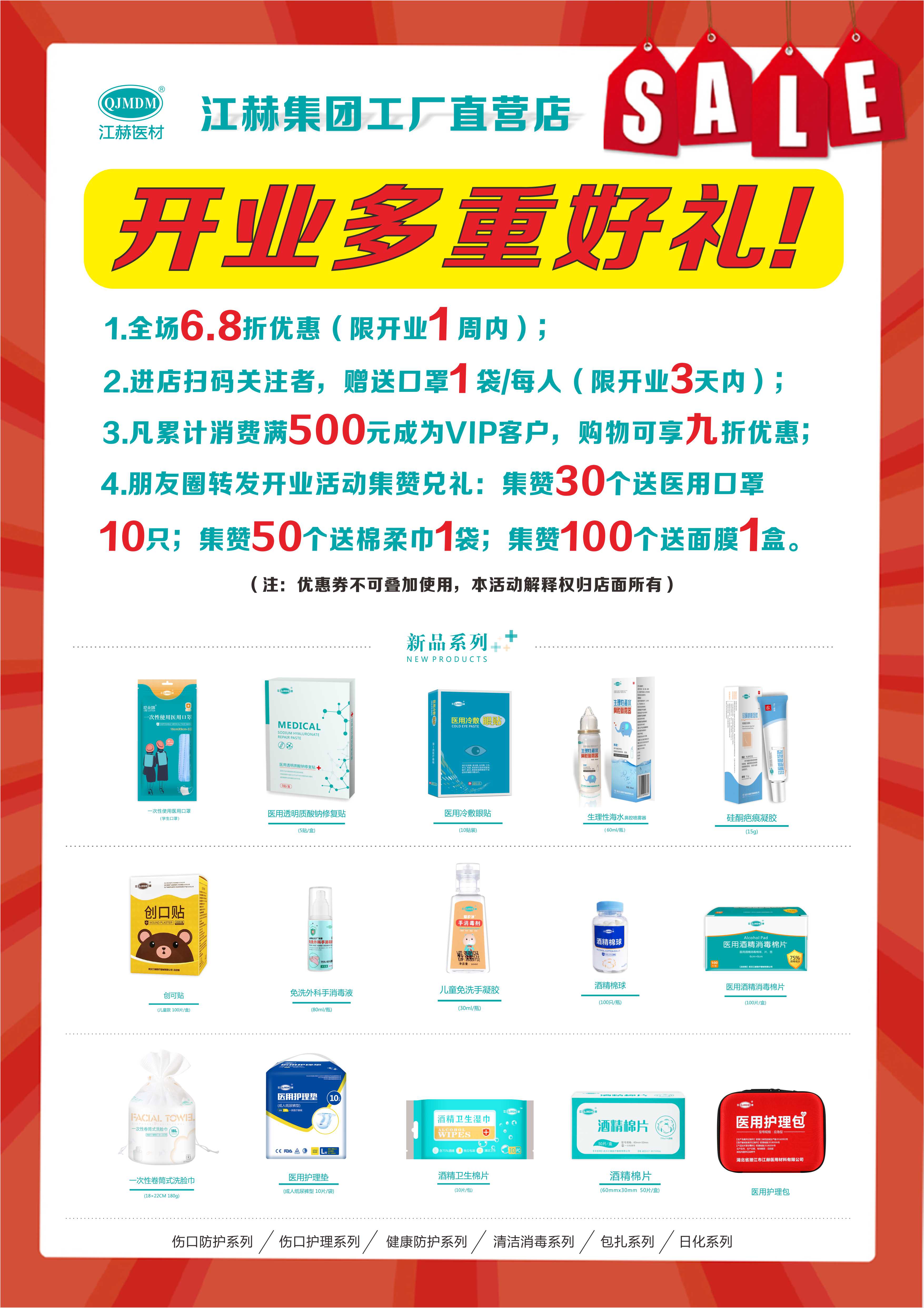 4. 朋友圈轉(zhuǎn)發(fā)開業(yè)活動集贊兌禮:集贊30個送醫(yī)用口罩10只;集贊50個送棉柔巾1袋;集贊100個送面膜1盒。