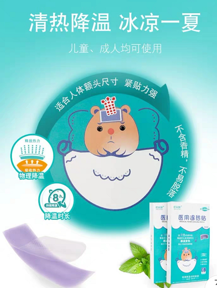 物理降溫是高熱患者除藥物治療外,最簡(jiǎn)易、有效、安全的降溫方法。醫(yī)用退熱貼還由于其具有揮發(fā)性,可吸收并帶走大量的熱量,使體溫下降、癥狀緩解。大人小孩都可使用。