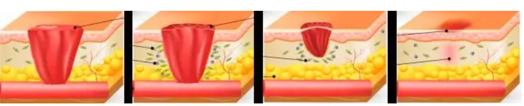 當(dāng)皮膚受傷后,機(jī)體會有一系列的生化程序試圖進(jìn)行修復(fù)?;具^程包括止血期,炎癥期,細(xì)胞增生期以及成熟及重塑期。
