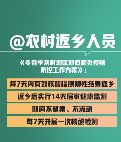 1月20日,國家衛(wèi)生健康委發(fā)布了《關(guān)于印發(fā)冬春季農(nóng)村地區(qū)新冠肺炎疫情防控工作方案的通知》,提出返鄉(xiāng)人員需持7天內(nèi)有效新冠病毒核酸檢測陰性結(jié)果返鄉(xiāng),返鄉(xiāng)后實行...